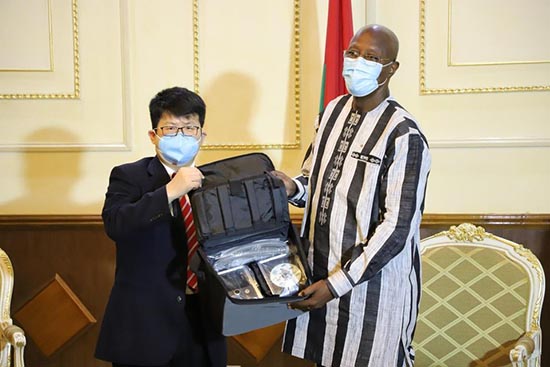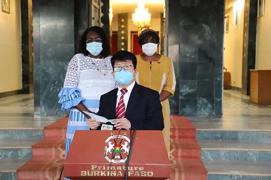Le vendredi 2 octobre 2020, S.E.M. LI Jian, Ambassadeur de Chine au Burkina Faso a remis un lot de matériels médicaux contre la Covid-19 au gouvernement burkinabè. La cérémonie de remise a eu lieu à la primature, honorée par la présence de S.E.M. Christoph Joseph Marie DABIRE, Premier Ministre du Burkina Faso, Pr. Léonie Claudine LOUGUE, Ministre de la Santé et Dr. Alimata J. Diarra-Nama, Représentante Résidente de l'OMS au Burkina Faso.
