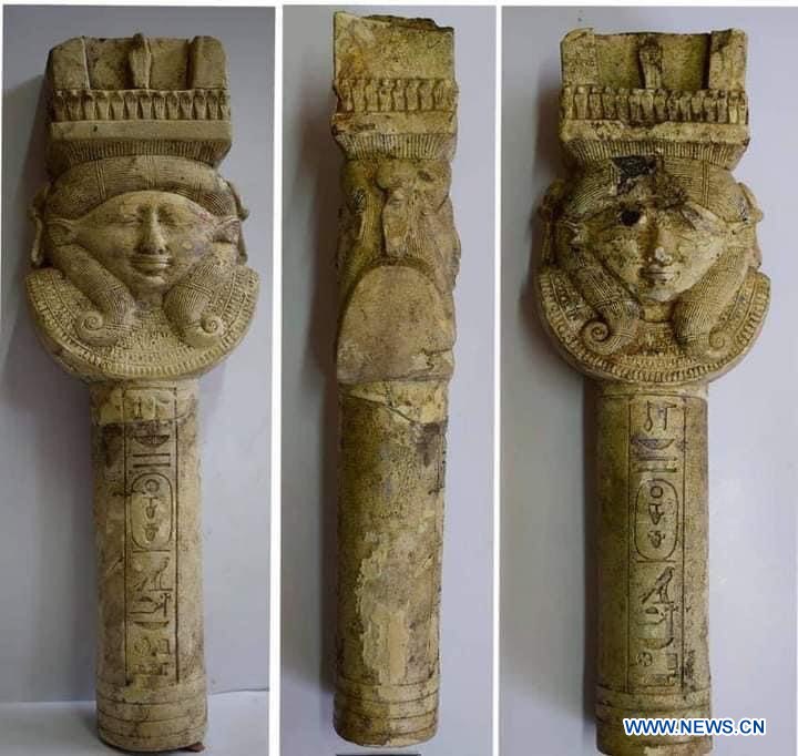 Les objets découverts comprennent un fragment d'un pilier en calcaire à l'effigie de la déesse Hathor, un groupe de br?le-parfums en fa?ence, un ensemble de pots en argile, une collection de statuettes, un ?il oudjat en or pur et des restes d'écailles en or.