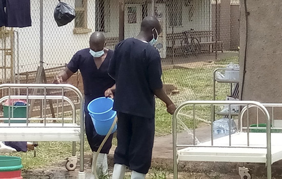 Des personnels de santé désinfectent des lits dans un centre de traitement Ebola à l'h?pital régional de Mubende, dans le district éponyme, en Ouganda, le 21 septembre 2022. (Xinhua/Nicholas Kajoba)