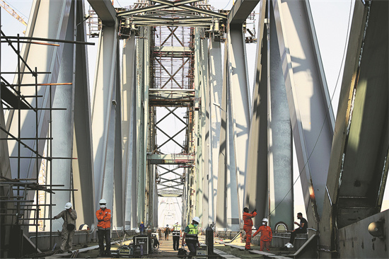 Des ouvriers sur le chantier de construction du pont ferroviaire du canal de Suez à Isma?lia, en égypte, le 5 juin. Les entreprises chinoises ont fait progresser la modernisation de ce pont. (Wang Dongzhen / Xinhua)