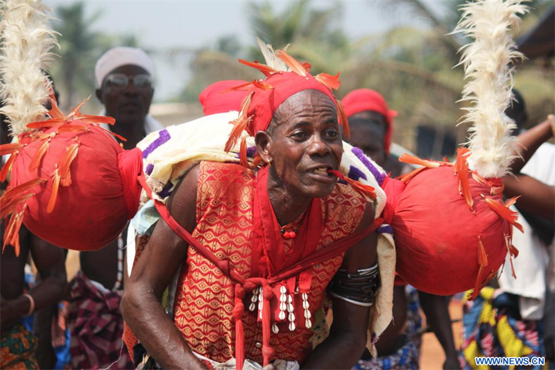 | Des habitants habillés en costumes traditionnels célèbrent les Vodun Days, à Ouidah, au Bénin, le 9 janvier 2025. (Xinhua/Seraphin Zounyekpe) |