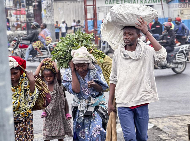 | Cette photo prise par un téléphone mobile le 1er février 2025 montre des vendeurs se dépla?ant à pied avec leurs produits dans un marché de rue à Goma, dans la province du Nord-Kivu, en République démocratique du Congo (RDC). (Xinhua/Zanem Nety Zaidi) |