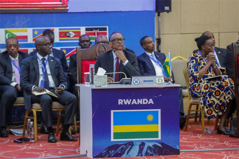| Le président rwandais Paul Kagame (au front) assiste à la session d'ouverture du sommet des chefs d'Etat et de gouvernement de la Communauté de l'Afrique de l'Est (EAC) et de la Communauté de développement de l'Afrique australe (SADC) à Dar es Salaam, en Tanzanie, le 8 février 2025. Les dirigeants africains ont appelé samedi à un "cessez-le-feu immédiat" dans l'est de la République démocratique du Congo (RDC) et ont réaffirmé leur soutien total à la recherche d'une solution durable au conflit en cours. (Xinhua/Emmanuel Herman) |