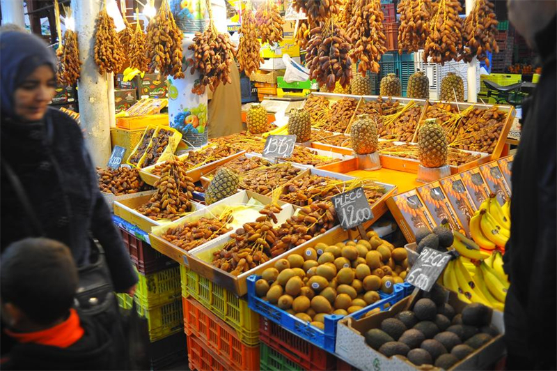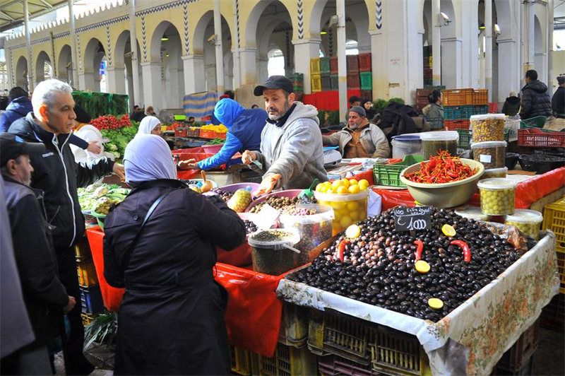 | Des Tunisiens font leurs courses pour le repas d'Iftar dans un marché de Tunis, en Tunisie, le 1er mars 2025. Le Ramadan a commencé en Tunisie le 1er mars. (Xinhua/Adel Ezzine) |
