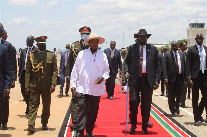 | Le président sud-soudanais Salva Kiir (au centre, à droite) accueille le président ougandais Yoweri Museveni à l'aéroport international de Juba, dans la capitale du Soudan du Sud, le 3 avril 2025. (Xinhua/Denis Elamu) |
