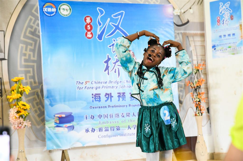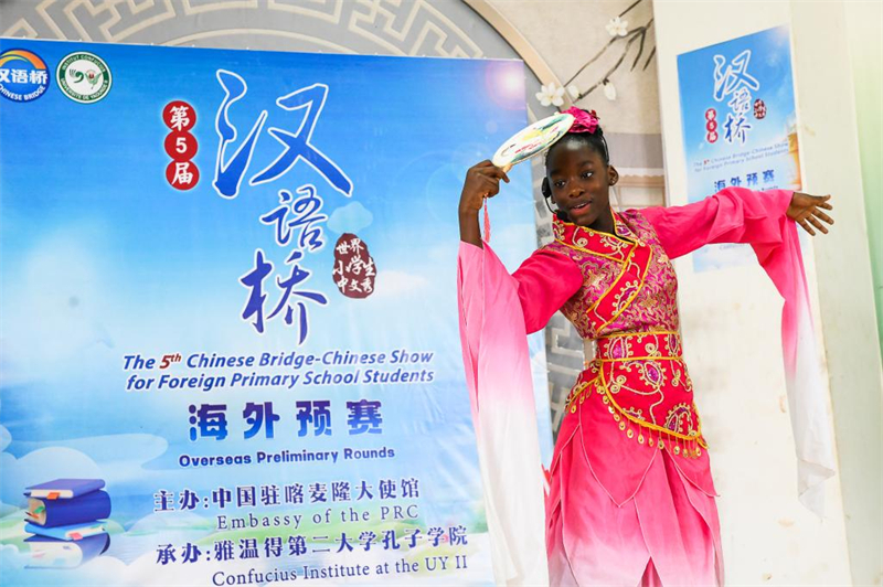| Une fille participe au 5e concours "Chinese Bridge" pour les élèves de l'école primaire au Cameroun, à l'Institut Confucius de l'Université de Yaoundé II, à Soa, au Cameroun, le 16 mai 2025. (Xinhua/Kepseu) |