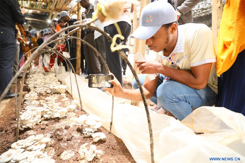 | Un apprenti prend des photos de champignons au Centre sino-rwandais de démonstration des techniques agricoles dans le district de Huye, au Rwanda, le 17 juillet 2025. (Xinhua/Huang Wanqing) |