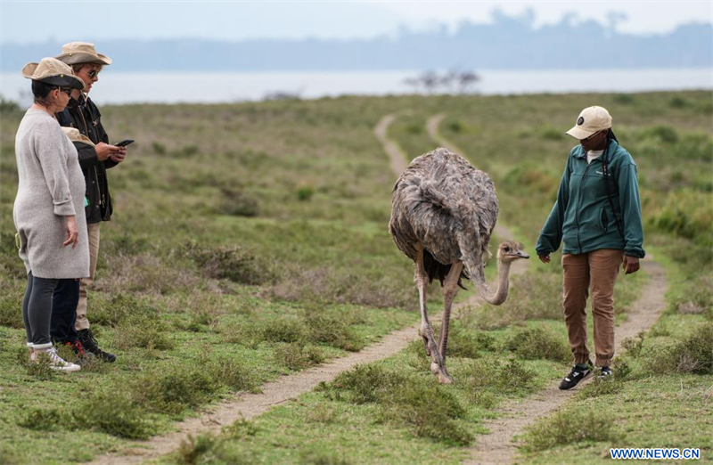 | Un garde forestier local interagit avec une autruche sur l'?le Crescent, sur le lac Naivasha, dans le comté de Nakuru, au Kenya, le 23 ao?t 2025. Le lac Naivasha, situé dans la vallée du Grand Rift à une altitude d'environ 1.900 mètres, est un lac d'eau douce. Son ?le Crescent est connue pour la faune sauvage en liberté, notamment des girafes, des zèbres et des antilopes. (Xinhua/Li Yahui) |