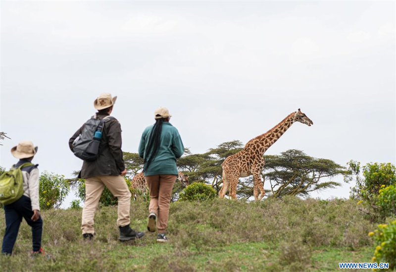 | Des touristes admirent des girafes sur l'?le Crescent, sur le lac Naivasha, dans le comté de Nakuru, au Kenya, le 23 ao?t 2025. Le lac Naivasha, situé dans la vallée du Grand Rift à une altitude d'environ 1.900 mètres, est un lac d'eau douce. Son ?le Crescent est connue pour la faune sauvage en liberté, notamment des girafes, des zèbres et des antilopes. (Xinhua/Li Yahui) |