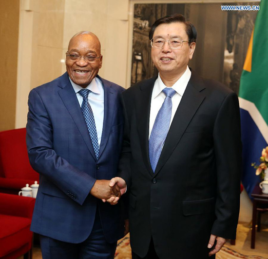 Zhang Dejiang, président du Comité permanent de l'Assemblée populaire nationale (APN, Parlement chinois), a rencontré Jacob Zuma, le président sud-africain au sujet du renforcement des relations bilatérales.