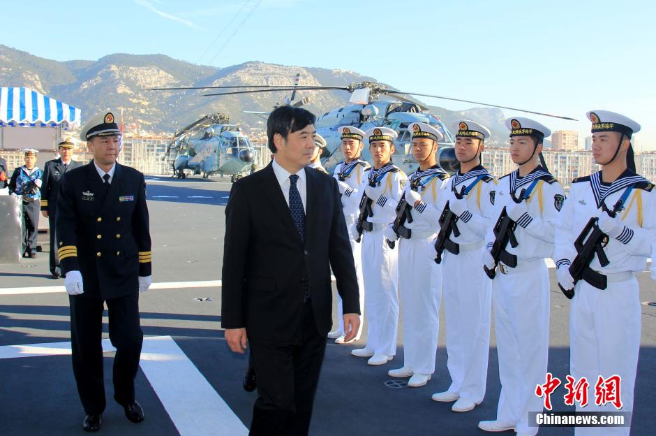 L'ambassadeur de Chine en France, Zhai Jun, inspecte la garde d'honneur du navire Changbaishan