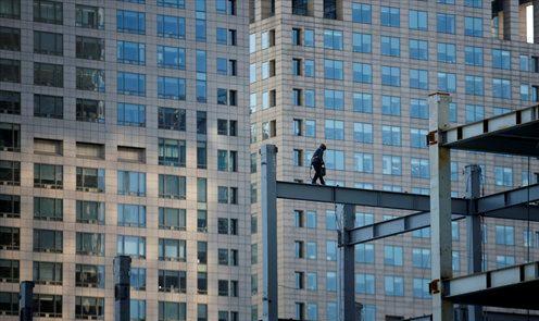 Photo : Un ouvrier joue les équilibristes sur une poutre d'acier, sur un chantier de construction d'un nouveau batiment commercial à Beijing. Photo: AP