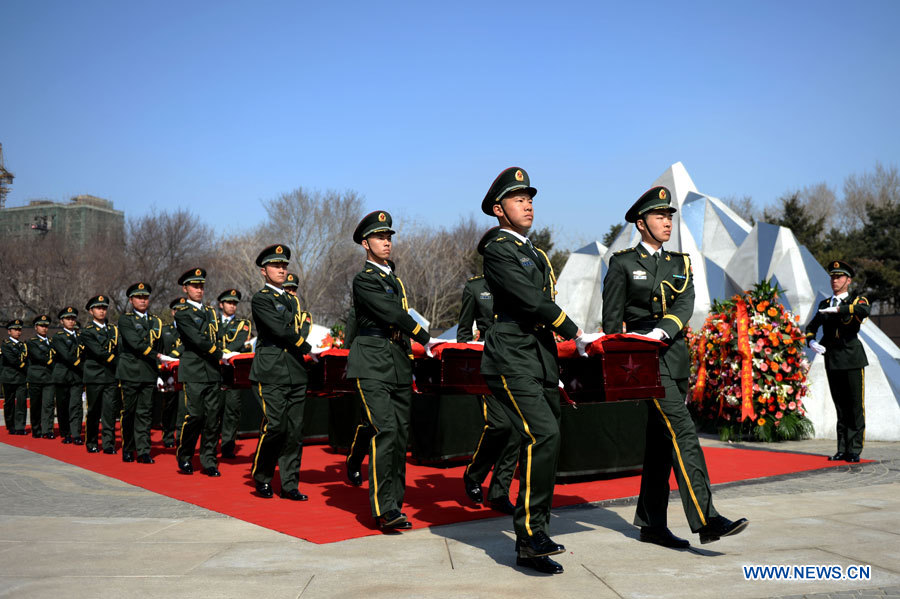 Couverts de drapeaux nationaux, les cercueils ont été transportés dans un parc des martyrs de Shenyang lors d'une cérémonie solennelle. Des responsables, des militaires, des vétérans de la guerre de Corée et leurs familles, ainsi que le public ont assisté à l'enterrement.