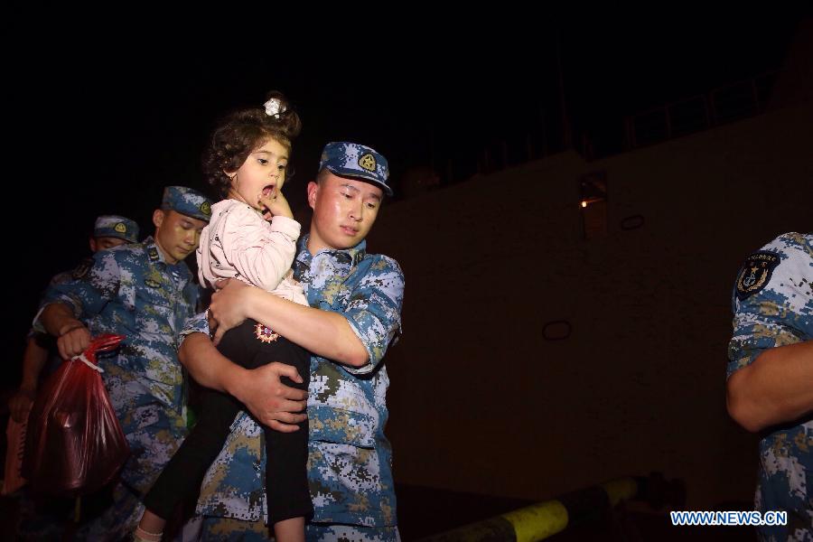 Jiang Guoping, commandant de la flotte chinoise chargée de la mission anti-pirate, a déclaré que c'est la première fois que la marine chinoise participe à une opération humanitaire internationale visant pour évacuer des ressortissants étrangers.