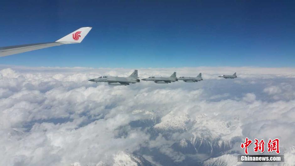 Le 20 avril 2015, l'avion du président Xi Jinping entre dans l'espace aérien du Pakistan, escorté par plusieurs chasseurs du pays d'accueil. (Photo : CNS/Ouyang Kai