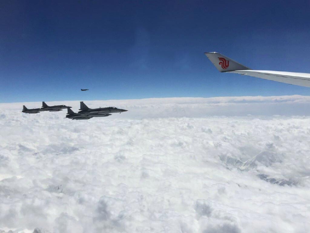 Le 20 avril 2015, l'avion du président Xi Jinping entre dans l'espace aérien du Pakistan, escorté par plusieurs chasseurs du pays d'accueil. (Photo : CCTV/Wang Yubo)