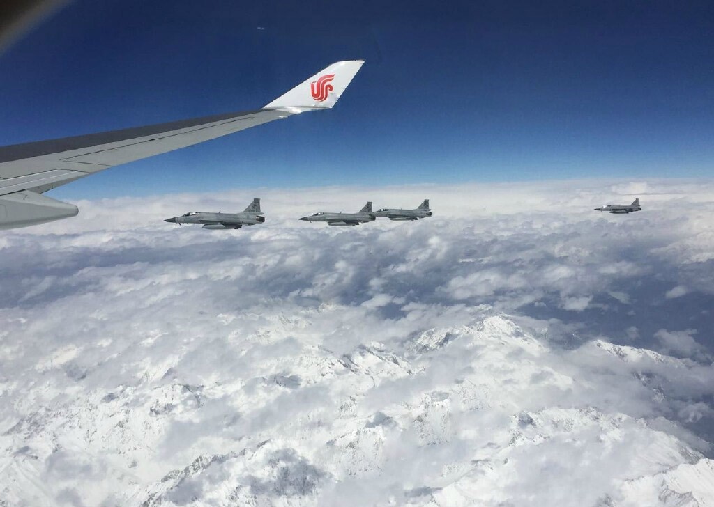 Le 20 avril 2015, l'avion du président Xi Jinping entre dans l'espace aérien du Pakistan, escorté par plusieurs chasseurs du pays d'accueil. (Photo : CCTV/Wang Yubo)