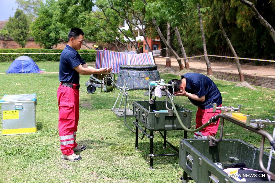 Photo prise le 1er mai 2015 au camp de l'équipe de secours chinoise à Katmandou, capitale du Népal. (Xinhua/Baiyang)