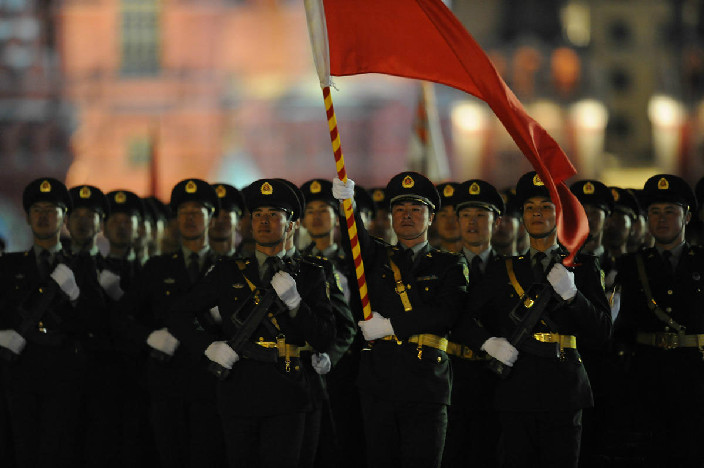 Des militaires chinois en répétition pour la parade militaire qui se tiendra le 9 mai sur la place Rouge en Russie. Photos prises le soir du 4 mai à Moscou.