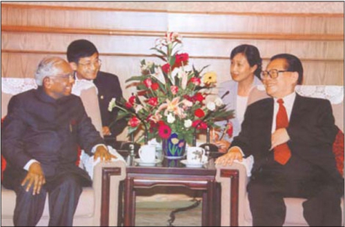 L'ancien président indien K.R.Narayanan et son homologue chinois Jiang Zemin en mai 2000 à Beijing.