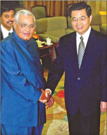 Une rencontre entre l'ancien Premier ministre indien Atal Bihari Vajpayee et l'ancien président chinois Hu Jintao en juin 2003 à Beijing.