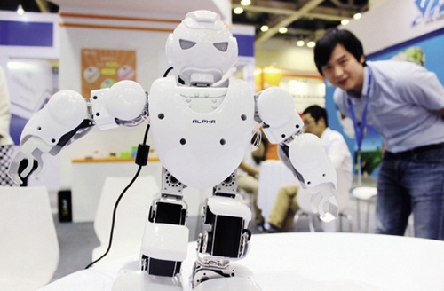 Un robot exposé lors de l'eMEX 2015 à Suzhou, au Jiangsu.