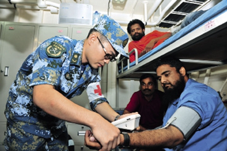 Un médecin de la marine chinoise prend la tension d'un ressortissant étranger évacué du Yémen.
