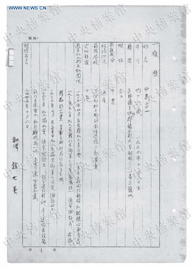 La publication des confessions de vendredi constitue la onzième des 31 confessions de criminels de guerre japonais, publiées sur le site Internet du Bureau national des Archives de Chine pour commémorer le 70e anniversaire de la fin de la Seconde Guerre mondiale.