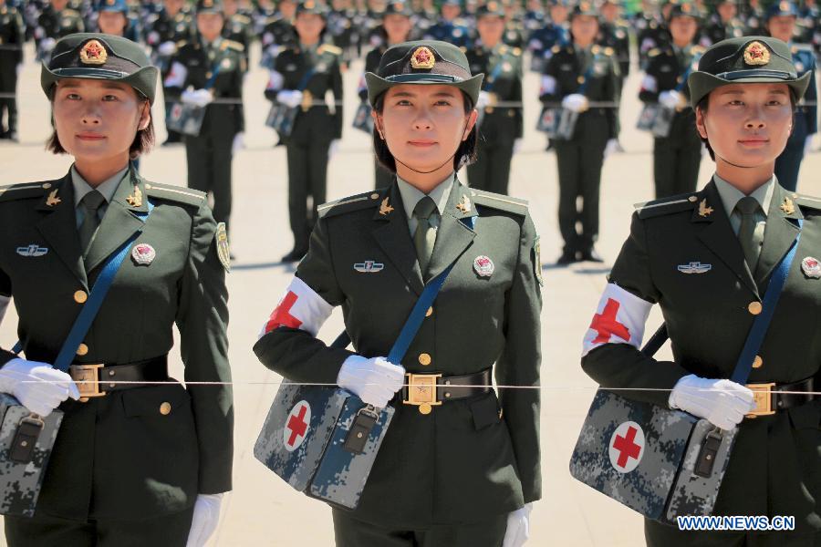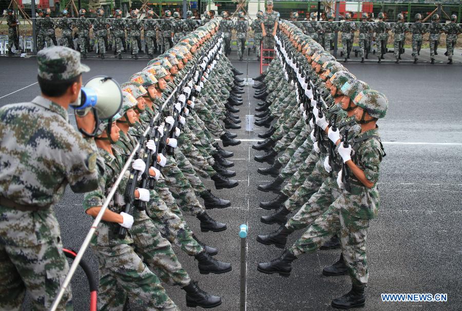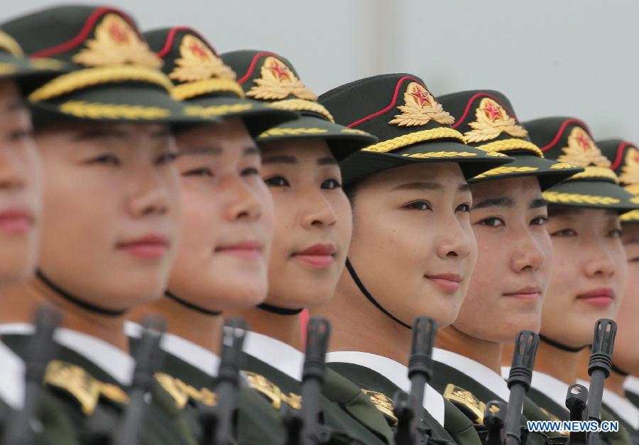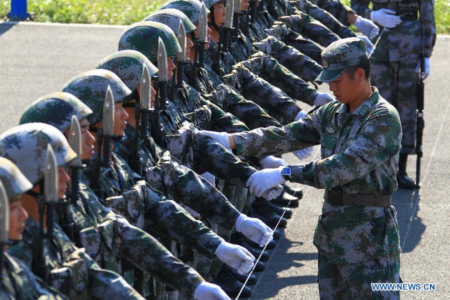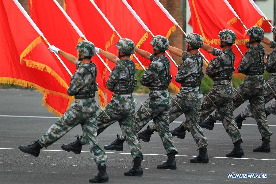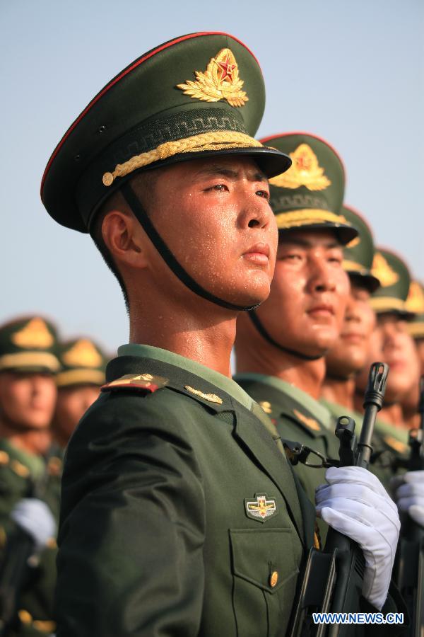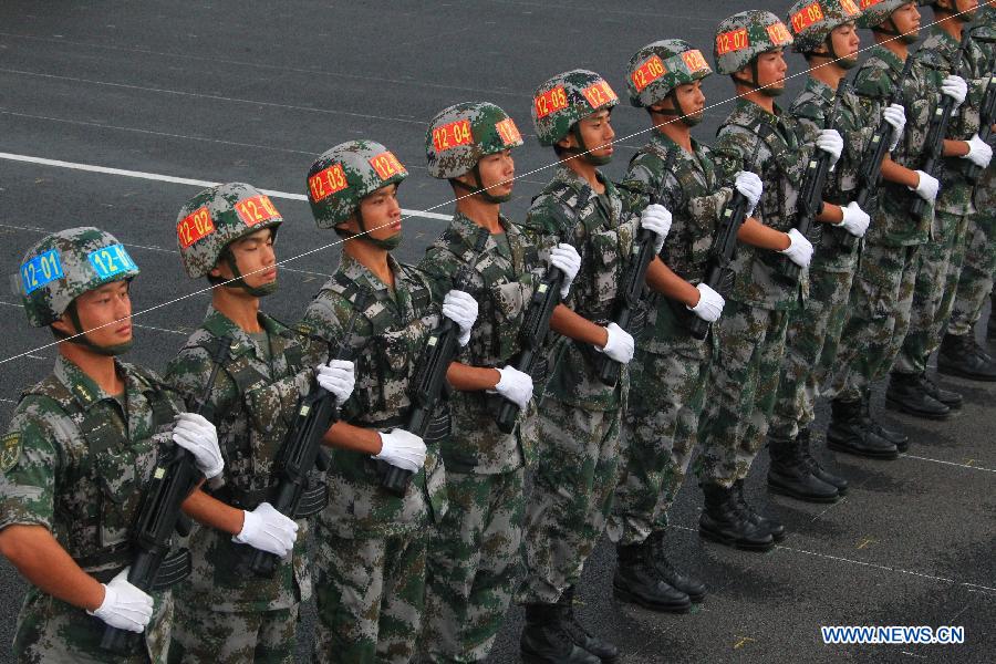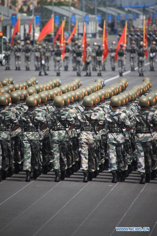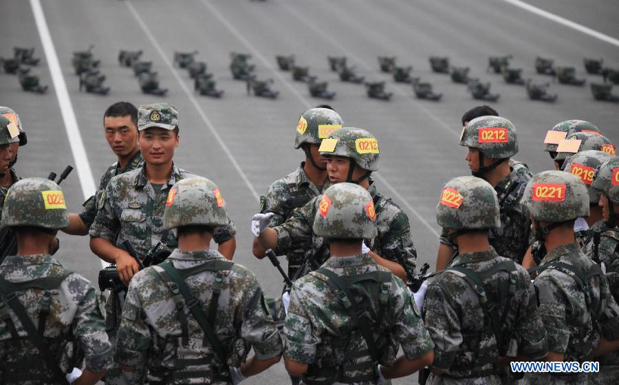 Photo prise le 28 juillet 2015 montrant des soldats qui participent à l'entra?nement pour le défilé du 3 septembre dans une base d'entra?nement. Des soldats et officiers militaires chinois se sont entra?nés pour le défilé chinois, programmé le 3 septembre à Beijing, afin de marquer le 70e anniversaire de la victoire de la Chine dans la guerre de résistance contre le Japon ainsi que dans la guerre mondiale anti-fasciste. (Xinhua/Tian Feng)