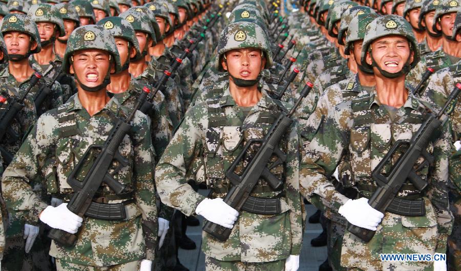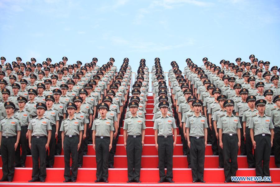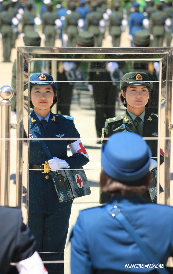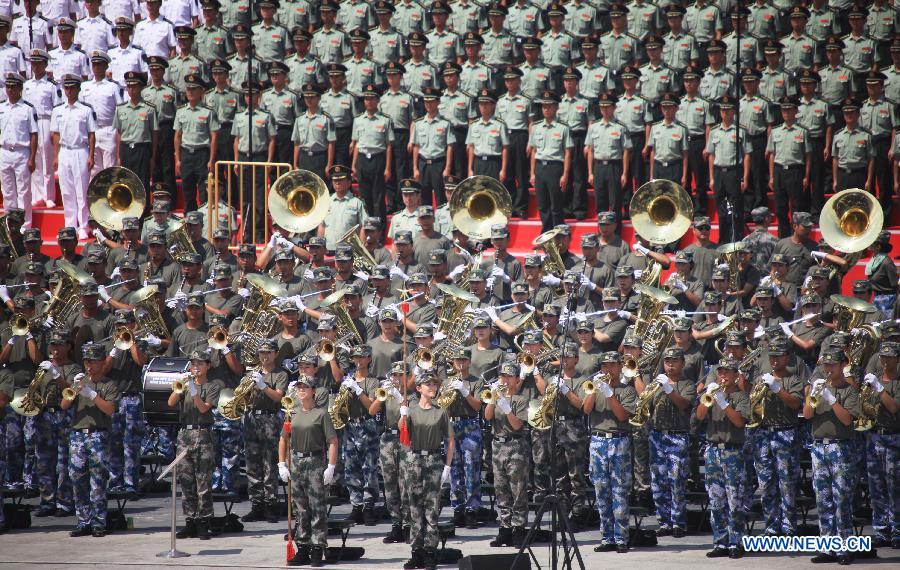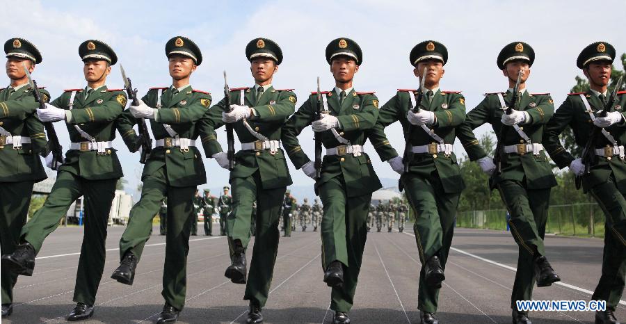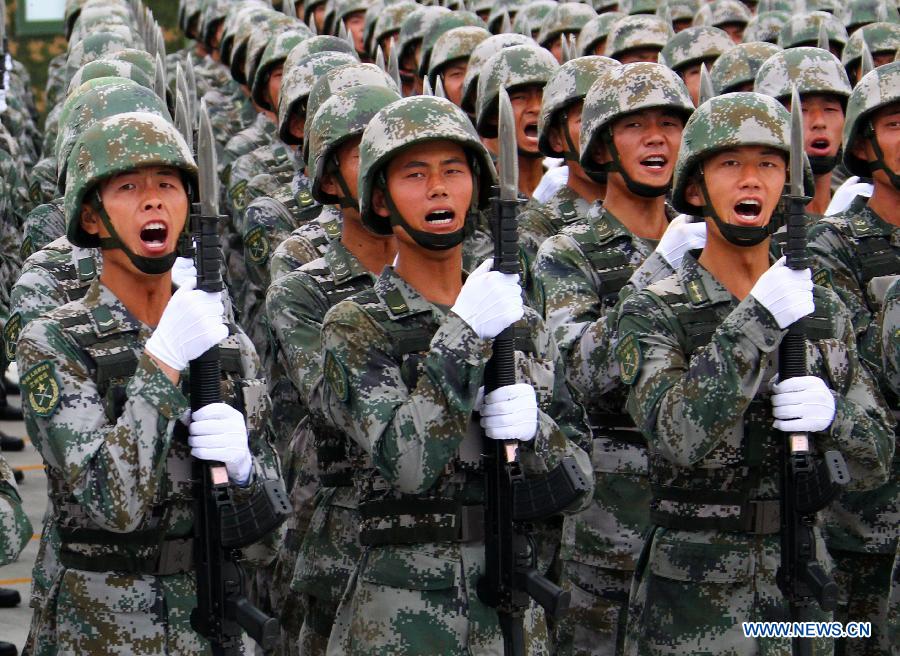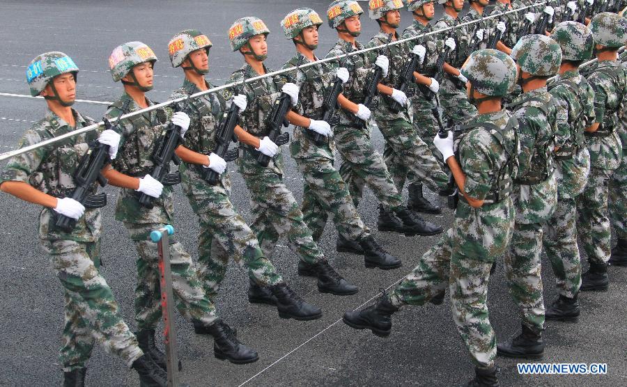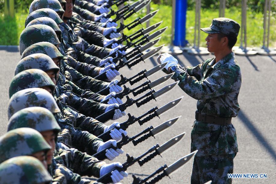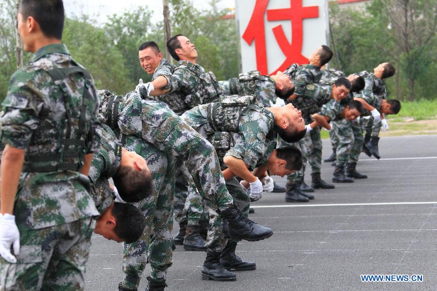 Photo prise le 28 juillet 2015 montrant des soldats qui participent à l'entra?nement pour le défilé du 3 septembre dans une base d'entra?nement. Des soldats et officiers militaires chinois se sont entra?nés pour le défilé chinois, programmé le 3 septembre à Beijing, afin de marquer le 70e anniversaire de la victoire de la Chine dans la guerre de résistance contre le Japon ainsi que dans la guerre mondiale anti-fasciste. (Xinhua/Tian Feng)