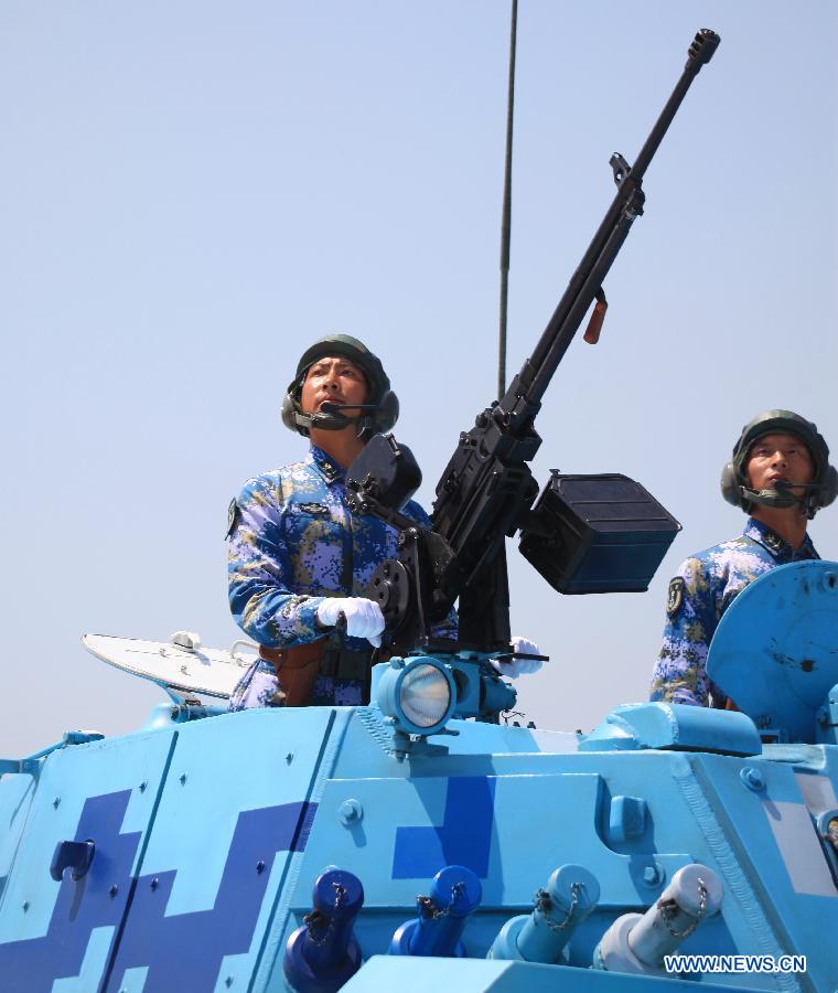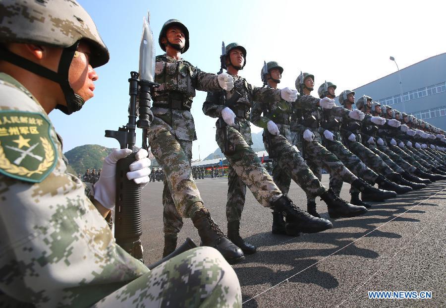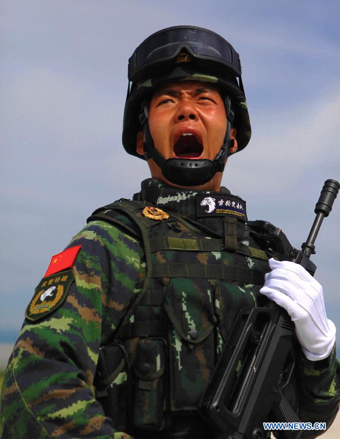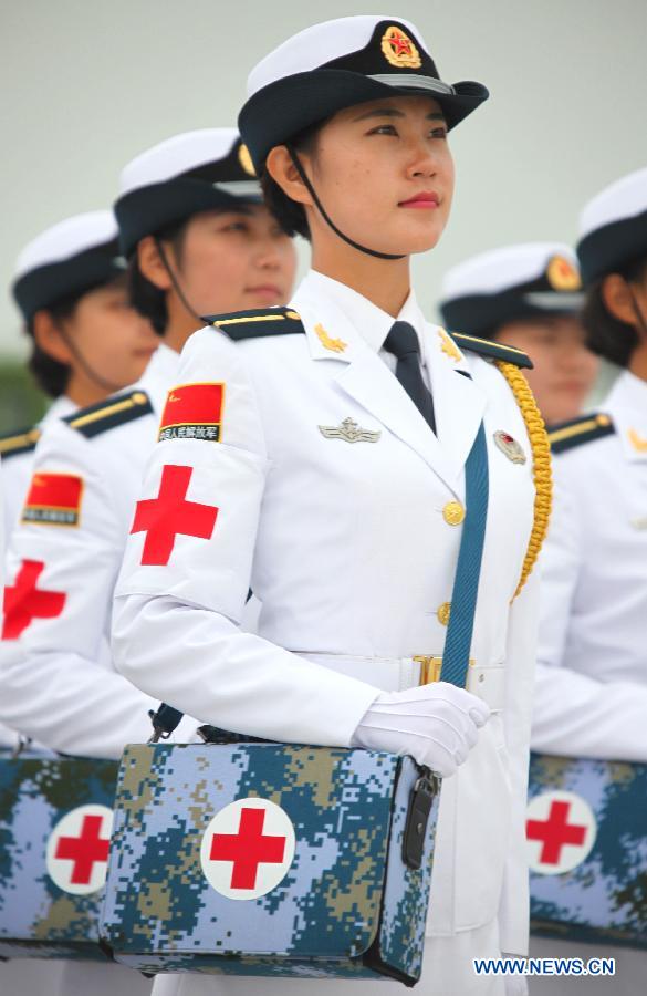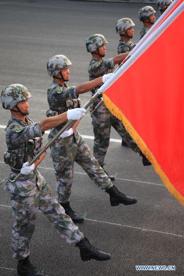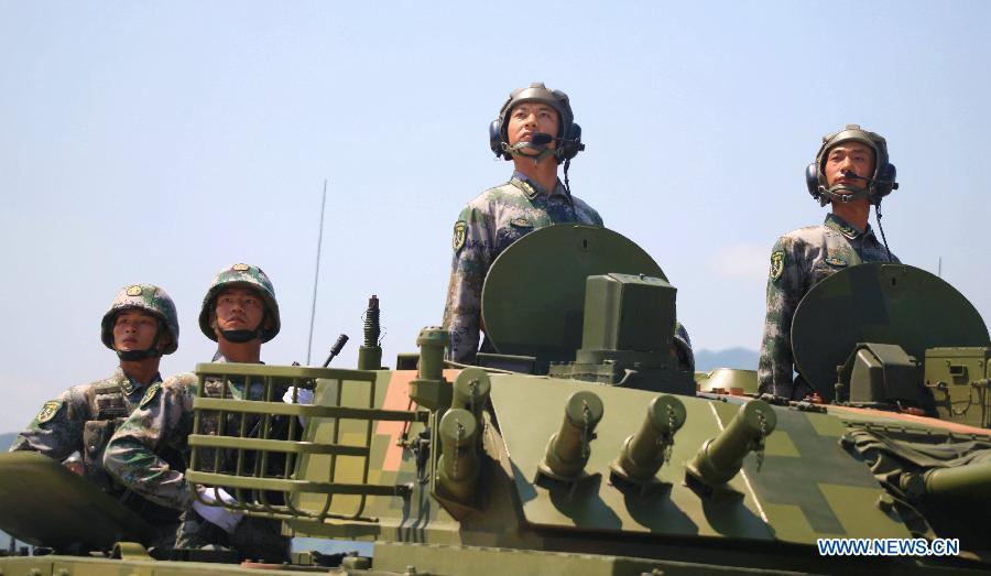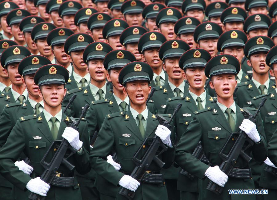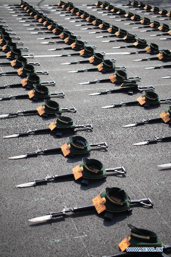 Photo prise le 28 juillet 2015 montrant des soldats qui participent à l'entra?nement pour le défilé du 3 septembre dans une base d'entra?nement. Des soldats et officiers militaires chinois se sont entra?nés pour le défilé chinois, programmé le 3 septembre à Beijing, afin de marquer le 70e anniversaire de la victoire de la Chine dans la guerre de résistance contre le Japon ainsi que dans la guerre mondiale anti-fasciste. (Xinhua/Tian Feng)