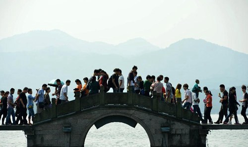 Photo : Des touristes visitent le Lac de l'Ouest à Hangzhou, la province du Zhejiang, à l'occasion de la fête nationale 2015. (photo d'archives)