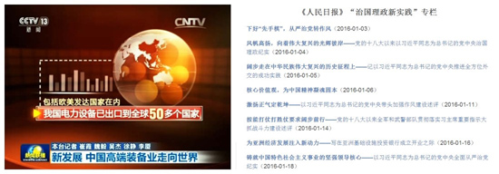 A gauche, une capture d'écran du sujet diffuse par le journal télévisé de la Télévision Centrale de Chine sur les ? nouvelles pratiques de gouvernance ?. A droite, l'article du Quotidien du Peuple sur le même sujet.