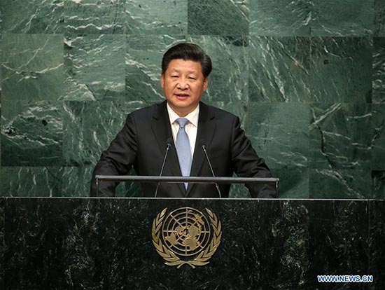 Xi Jinping prononce un discours intitulé "Construire un nouveau type de relations internationales caractérisées par une coopération gagnant-gagnant, et créer une communauté de destin pour l'humanité", lors du débat général de la 70e session de l'Assemblée générale des Nations unies, le 28 septembre 2015. (Xinhua/Pang Xinglei)