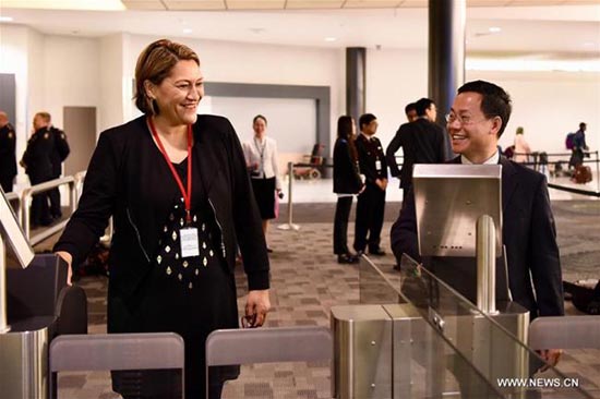 Le ministre des douanes néo-zélandais Meka Whaitiri (à gauche) et Qu Guangzhou, chargé d'affaires de l'ambassade de Chine présent à la cérémonie officielle du lancement de SmartGate à l'aéroport international d'Auckland, le 17 novembre 2017.