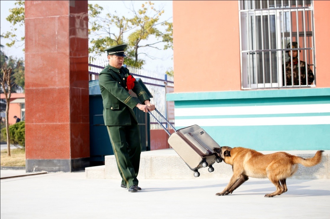 30 novembre 2017, Wang Xule, instructeur au détachement de la police armée du peuple chinois de Suqian, dans le comté de Siyang, portant une grosse fleur rouge sur son uniforme avant de rentrer chez lui, voit le chien qu'il a formé mordre affectueusement sa valise. (Photo Wu Jiahong / le Quotidien du Peuple)