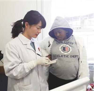 Yin Xianqin, gynécologue et obstétricienne de l'équipe médicale, écrit une ordonnance en anglais pour une future mère. (Photo Wan Yu, journaliste au Quotidien du Peuple)