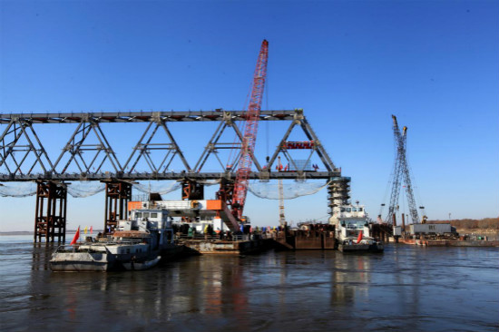 Des ouvriers terminent les travaux sur le corps principal de la partie chinoise du pont ferroviaire trans-fleuve menant à la Russie, à Tongjiang, dans la province du Heilongjiang (nord-est de la Chine), le 13 octobre 2018. (Photo / Xinhua)