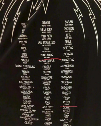 Les trois marques présentaient un design similaire, à savoir une liste de villes et de pays qui incluait Beijing et Shanghai comme faisant partie de la Chine. Cependant, sur son modèle, Versace a considéré Hong Kong et Macao comme des nations distinctes. Coach et Givenchy ont fait la même chose avec Hong Kong et Taiwan.
