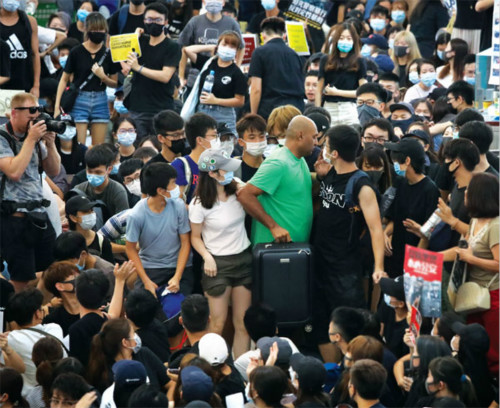 Un passager aérien, vêtu d'une chemise verte, se dirige vers une porte du hall des départs par le terminal 1 bondé de l'aéroport international de Hong Kong, le 13 ao?t 2019. (Photo / China Daily)