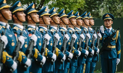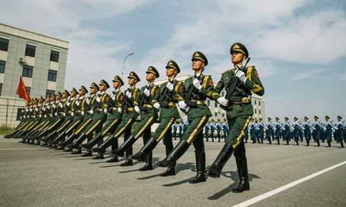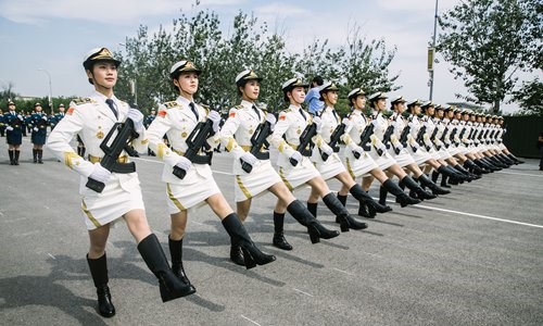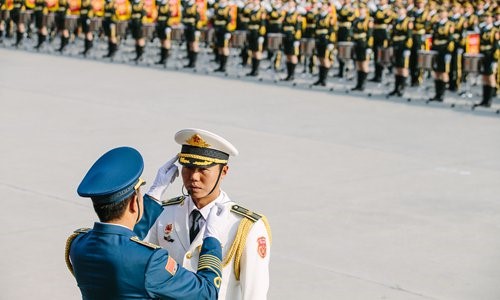 En préparation du défilé du 1er octobre célébrant le 70e anniversaire de la fondation de la République populaire de Chine, la phalange des gardes d'honneur de l'armée, de la marine et des forces aériennes de l'Armée populaire de libération (APL) suit un entra?nement au centre de formation du défilé, dans le district de Changping de Beijing, le 17 septembre. (Photo Li Hao / GT)