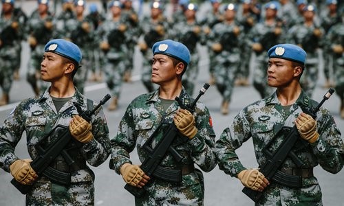 La phalange des casques bleus chinois s'entra?ne le 17 septembre au centre de formation du défilé, dans le district de Changping de Beijing, le 17 septembre. (Photo Li Hao / GT)