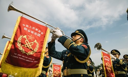 La fanfare militaire commune de l'Armée populaire de libération chinoise à l'exercice au centre d'entra?nement du défilé, dans le district de Changping de Beijing, le 17 septembre. (Photo Li Hao / GT)