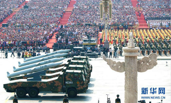 La Chine a dévoilé les missiles de croisière anti-navires YJ-18/18A lors du défilé militaire au centre de Beijing mardi.