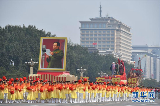 Un grand portrait de Mao Zedong a été présenté lors de la parade de masse de la Fête nationale organisée mardi à Beijing pour célébrer le 70e anniversaire de la fondation de la République populaire de Chine (RPC).