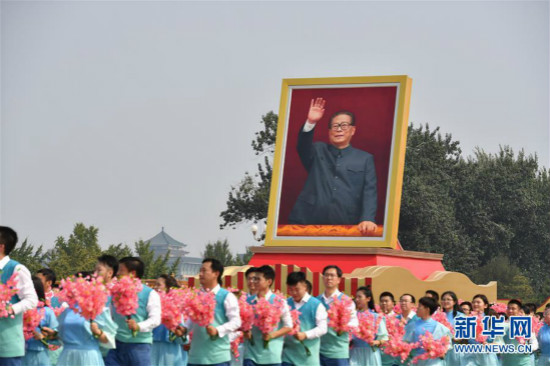 Un grand portrait de Jiang Zemin a été présenté lors de la parade de masse du 70e anniversaire de la fondation de la République populaire de Chine mardi à Beijing.