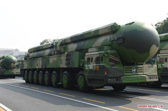 La formation de missiles nucléaires Dongfeng-41 vue lors du défilé militaire célébrant le 70e anniversaire de la fondation de la République populaire de Chine, le 1er octobre 2019 à Beijing. (Xinhua / Xia Yifang)