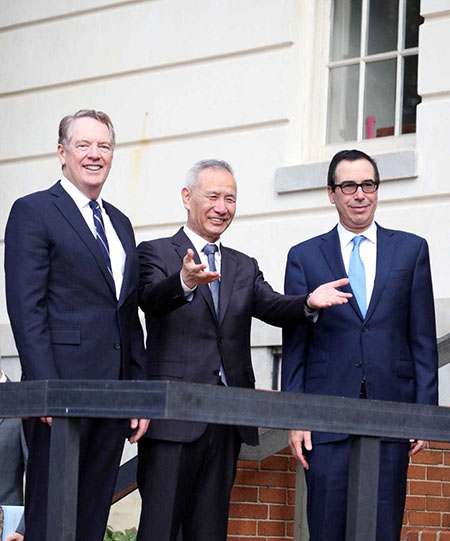 Le vice-Premier ministre chinois Liu He (au centre) arrive au siège du bureau du représentant au Commerce des états-Unis et est accueilli jeudi matin par le représentant au Commerce Robert Lighthizer (à gauche) et secrétaire au Trésor, Steven Mnuchin. La treizième série de négociations commerciales de haut niveau entre la Chine et les états-Unis se poursuivra jusqu'au 11 octobre. (Photo Zhao Huanxin / China Daily)