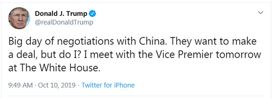 ? Grand jour de négociations avec la Chine. Ils veulent conclure u accord, mais moi ? Je rencontrerai le vice-Premier ministre demain à la Maison Blanche ?, a tweeté Donald Trump le 10 octobre matin, peu après l’arrivée de M. Liu au siège du bureau du représentant au Commerce des états-Unis pour des entretiens avec le représentant au Commerce Robert Lighthizer et le secrétaire au Trésor Steven Mnuchin.
