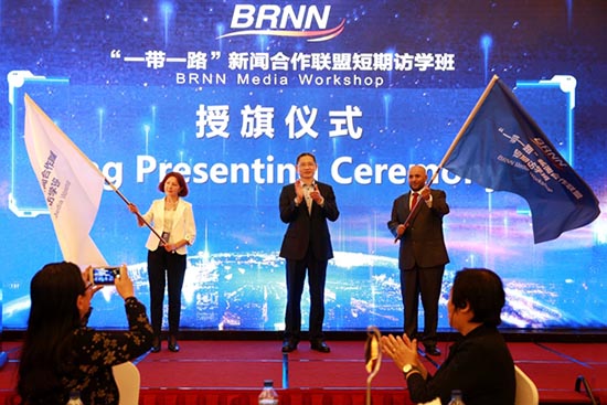 Une vue de la cérémonie de remise de la bannière au 2e groupe de visite d'étude de courte durée de l'Alliance de coopération des médias ? Une Ceinture, une Route ? (Photo Hou Xinying)